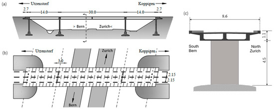 The Z24 Bridge [17,44]: (a) longitudinal section, (b) top view, (c) cross section.