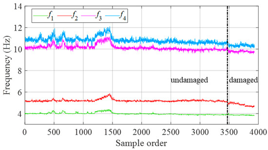 Using stochastic subspace identification, the first four modal frequencies were derived from the vibration data of the Z24 Bridge. Preprocessing eliminated missing samples from the original dataset, resulting in a time series of 3932 samples, as illustrated in Figure 10. The dashed vertical line represents the point where damage begins. The fluctuations in modal frequencies, primarily due to environmental factors, are pronounced and overshadow the relative changes caused by damage. This makes it challenging to differentiate between the intact and damaged states, highlighting the need to eliminate environmental effects.