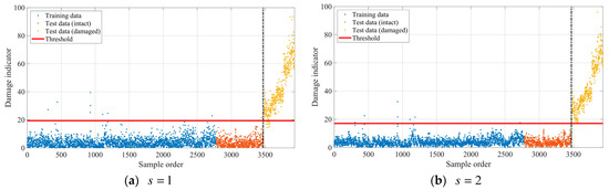 In order to demonstrate the performance of the proposed method, the cumulative T2 statistics were calculated for the normalized modal frequencies in both the training and test datasets. The damage detection results using the cumulative T2 statistics with and are, respectively, shown in Figure 14. In the image, the point above the threshold red line indicates recognition as damage, while the point below the threshold red line indicates unrecognized damage. The left side of the vertical black dashed line is in an undamaged state, and the right side of the vertical black dashed line is in a damaged state. It is seen that rare damage indicators fall beyond their corresponding thresholds when the Z24 Bridge is in an intact state and more damaged samples are successfully detected as the number of consecutive samples used to calculate the cumulative statistics increases. The damage detection rates corresponding to Figure 14 are calculated and listed in Table 2. It can be seen that the false alarm rates are very low for all the damage indicators when the Z24 Bridge is in the intact state. Comparing the false alarm rates in the test and training sets under two different scenarios, the values of the two are very close, indicating that the proposed method has a good generalization of the model. In addition, when the Z24 bridge is in a damaged state, the damage indicator can effectively detect the damage to the bridge, and the damage recognition rate in both cases ( or ) is greater than 96%.