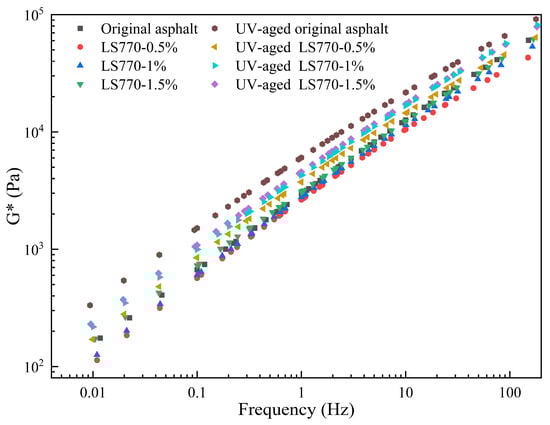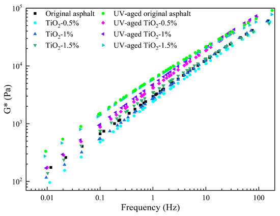 By conducting a frequency sweep on the asphalt samples, the dynamic shear modulus (G*) master curve was calculated. This frequency range simulates the effect of different vehicle speeds, with lower frequencies corresponding to slow-moving traffic and higher frequencies to fast-moving vehicles. The time–temperature superposition principle (TTSP) was utilized to construct the master curve. The reference temperature was 58 °C [46]. G* reflects the stiffness of the asphalt. Higher G* values indicated higher resistance to deformation.