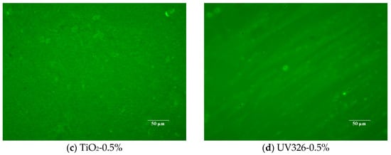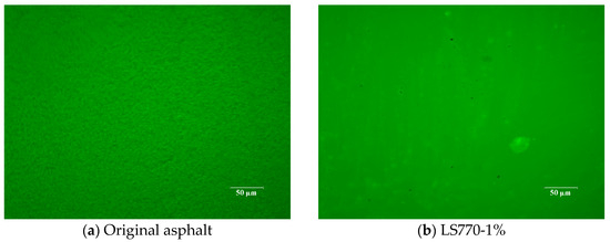 As shown in Figure 9, the fluorescent substance did not produce agglomeration in the asphalt. This indicates that LS770, TiO2, and UV326 were dispersed throughout the asphalt under a steady condition. Similar FM images have been shown in other studies [44,51]. This indicates that the anti-UV aging agents have good compatibility with the asphalt. This is primarily due to the large specific surface area of the anti-UV aging agents, which provide a higher contact area with the asphalt [51]. This extensive contact promotes better dispersion and facilitates the dissolution of the anti-UV aging agents within the asphalt. The anti-UV aging agents have good compatibility with asphalt.