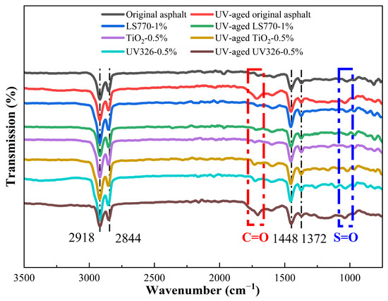 FTIR is commonly utilized to explore the functional group aging index of aged asphalt, providing a quantitative analysis of asphalt aging from a microscopic perspective. By detecting changes in specific functional groups, such as C=O and S=O groups, FTIR helps measure the extent of UV aging within the asphalt binder. FTIR tests were conducted on anti-UV aging agent-modified asphalt with recommended additive dosages, and the results are shown in Figure 10 and Figure 11.