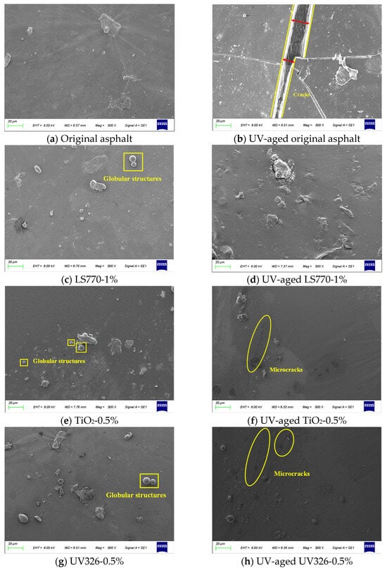 By observing Figure 12c,e,g, globular structures can be observed in the microscopic morphology of anti-UV aging agent-modified asphalt [19]. These structures may represent the anti-UV aging agents, suggesting that they are dispersed within the asphalt binder [26]. This is attributed to the large specific surface area of the anti-UV aging agents, which allows them to be fully dispersed within the asphalt. Comparing Figure 12c,d, there is no significant change in the microscopic morphology of LS770-1% after UV aging. This indicates that LS770-1% provides strong protection against UV degradation, effectively preserving the structural integrity and surface characteristics of the asphalt. As shown in Figure 12f,h, the surfaces of UV-aged TiO2-0.5 and UV-aged UV326-0.5% display microcracks. Although anti-UV aging agent-modified asphalt also develops microcracks after UV aging, the crack width is significantly reduced.