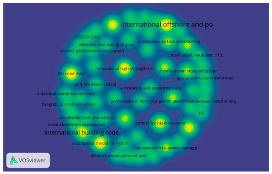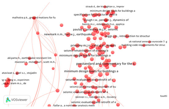 - As per Part 5: co-citation—cited references (case 1), the total strength of the co-citation links with other cited references was calculated. The cited references with the greatest total link strength were selected and the prestandard and commentary for the seismic rehabilitation of building 2000 paper leads this category, with 135 citations and 150 total link strengths. Similarly, in the Category V: co-citation—cited sources (case 2) analysis results, the sources with the greatest total link strength were calculated, and the International Offshore and Polar Engineering Conference took the lead in this category. In the same way, in the co-citation—cited authors (case 3) analysis result, the authors with the greatest total link strength were selected and Priestley, M.J.N., took the lead with 868 citations and 32,230 total link strengths;