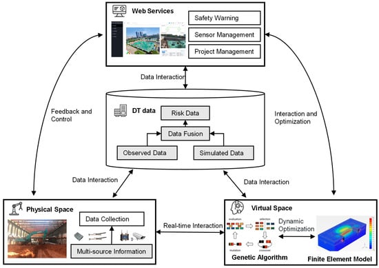 On-site monitoring represents the most effective means of observing the deformation of excavation pits. Traditional manual monitoring and management methodologies are no longer adequate to guarantee the safety of large-scale excavation construction. Instead, automated monitoring technologies and intelligent early warning systems are being extensively investigated and implemented. Various monitoring technologies, including automated total stations [20] and three-dimensional laser scanning (3DLS) [21], are commonly employed in pit monitoring. Concurrently, the advent of information technology based on the Internet of Things (IoT) has facilitated the automation of pit monitoring, with online early warning systems evolving from information management [22] to intelligent risk warnings [23]. In the context of construction monitoring of excavation projects, various data collection technologies, such as Global Positioning System (GPS), automated total stations, 3DLS, intelligent sensor networks, etc., produce information typically utilized in isolation. There are a few cases where multiple monitoring and numerical simulation technologies have been applied. The challenge lies in that few systems can manage multi-source heterogeneous data. DT technology can efficiently integrate and utilize these technologies to ensure adequate construction monitoring and risk warning [24,25,26].