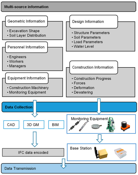 The excavation is a dynamic process, and the multi-source information present in the physical space must be collected and transmitted to the data center, as illustrated in Figure 2. Geometric information, personnel information, and equipment information are typically conveyed by the CAD model, 3D geological model (3DGM), and building information model (BIM). Those models can be transmitted to the twin database after being converted using Industry Foundation Classes (IFC). Design information about support structures, soil, loads, and water levels is subject to change during construction. This information can be collected in real-time using sensors, automated total stations, and 3D laser scanning (3DLS) and then transmitted to the twin database after compilation.