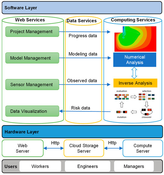 It is necessary to encapsulate numerical models, optimization algorithms, and data into services to meet the needs of engineering applications. A web-based intelligent monitoring system is developed, as illustrated in Figure 4, which serves workers, engineers, and managers. Computing services, web services, and data services are deployed on different servers, enabling cloud computing and reducing users’ software and hardware requirements. The web services manage excavation progress, sensors, observed data, and DT models. The computing services integrate parametric modeling algorithms and inverse analysis optimization algorithms for DT modeling and model updates. The excavation progress, modeling, observed, and risk data are stored and visualized on the web page. The system will be introduced in detail in Section 4.