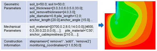 The parametric modeling algorithm enables establishing a deep foundation pit FEM by inputting key modeling parameters and outputting deformation results. The author refines the key modeling parameters for each support type. The key modeling parameters include geometric, mechanical, and construction information. These can be obtained from various sources, including design drawings, geological exploration reports, design specifications, and construction plans. For example, as illustrated in Figure 6, by inputting the parameters on the left side of the figure, the FEM on the right side of the figure can be generated within one second.