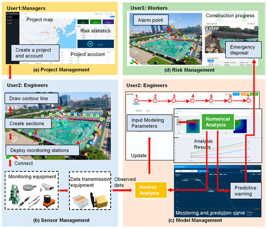 Figure 4 shows the overall architecture of the prototype system proposed in this study. It includes four functional modules: project management, sensor management, model management, and risk management. Figure 9 shows the prototype system application process. It is designed for managers, engineers, and workers. The following section will provide a detailed introduction to the system’s features.