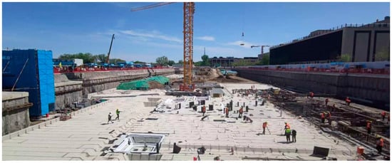 To verify the effectiveness of the monitoring system proposed in the previous section, the author chose a pit excavation project in Beijing as a case study to demonstrate its application. Figure 11 depicts the excavation construction site. Using the proposed DT modeling architecture, the excavation’s field monitoring data were collected, a virtual model of the excavation was established, and the model parameters were updated based on the monitoring data. The updated model more accurately predicts excavation deformation, thus ensuring safety at every stage of construction on site.