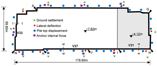 The foundation pit of this project measures 178.60 m in length and 69.80 m in width, with an excavation depth ranging from 4.0 to 7.50 m. The excavation plan is illustrated in Figure 12. Considering the depth of the excavation and the surrounding environment, the pit primarily employs a bored pile + anchor support. The J–K sectional view is shown in Figure 13. The eastern side of the excavation pit exhibits a relatively shallow depth, with the H–I employing a cantilever pile support.
