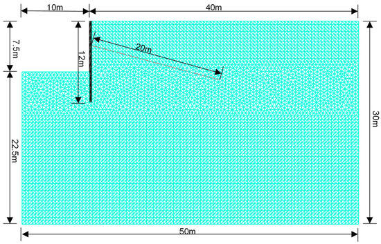 Take the J–K section as an example. The depth of excavation of the J–K section of the pit is 7.5 m. In this model, the soil is assumed to have dimensions of 30 m × 50 m. The mesh size of the soil to be analyzed is set at 0.5 m. The number of elements is 12,223. The GM of the excavation pit can be rapidly constructed, as demonstrated in Figure 15.