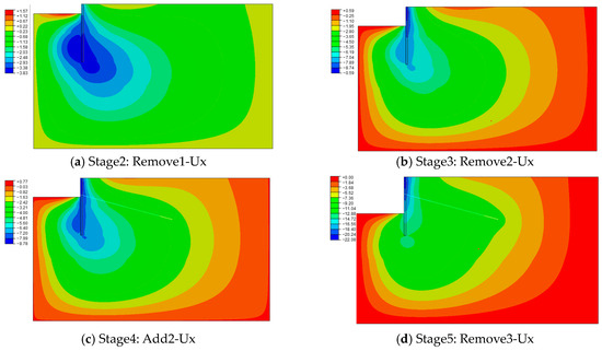 Based on the construction plan delineated in Table 1, the input of construction data enables establishing a finite element model that simulates the entire excavation process. Before the commencement of construction, a preliminary risk analysis is undertaken to predict potential construction risks. The horizontal displacement of each stage, as illustrated in Figure 16, indicates that the maximum deformation occurs at the top of the supporting piles. The system can automatically extract the displacement of the measuring points, which can then be used to evaluate the risk of excavation. Currently, the system does not support the output of internal forces in the supporting structure, and further improvements need to be made in future research.