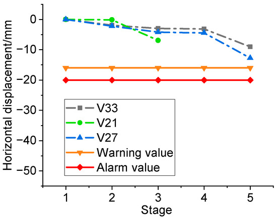 During the foundation pit excavation, an automated total station monitored the deformation of the pile top. Some monitoring points (including V21, V27, and V33) were selected to analyze the deformation pattern of horizontal displacement of the pile top in each section. Monitoring data are lacking for Stage 1, the piling phase, due to the absence of monitoring points. After construction, the top deformation was minimal, leading us to assume a measured value of zero for stage 1. As shown in Figure 18, the horizontal displacements at all stages did not exceed the specified limits. Compared with Figure 18, it is clear that the model used in the preliminary analysis is inaccurate and needs to be updated.