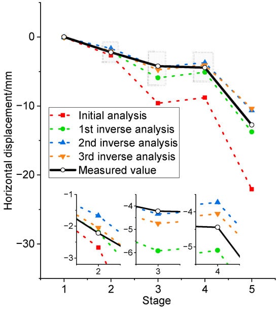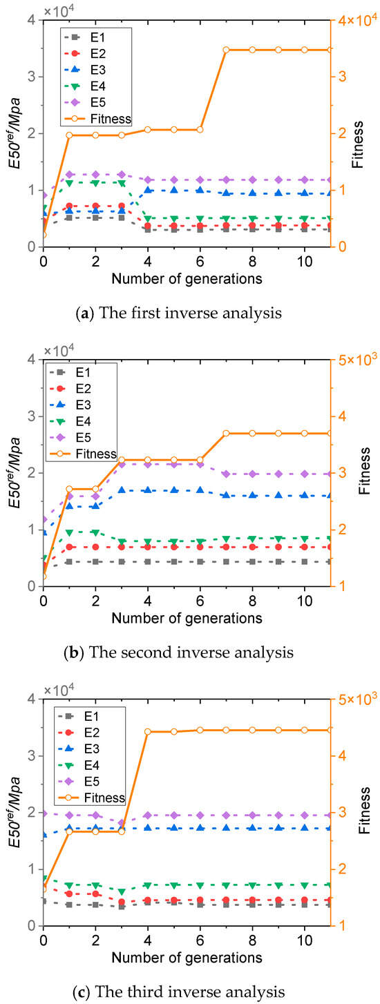 The elastic modulus (E50ref) of the five soil layers was employed as the parameter for inverse analysis. The first inverse analysis employed the measured horizontal displacement at stage 2 as the target value. The second inverse analysis utilized the measured horizontal displacement at stage 2 and stage 3 as the target values. Finally, the third inverse analysis employed the measured horizontal displacement at stage 2, stage 3, and stage 4 as the target value. The initial parameters were adopted from the geological survey report. After each inverse analysis, the models were updated with the optimal parameter solution. Figure 19 illustrates the trends of soil parameters and fitness during the three iterations of inverse analysis. It shows that as the number of generations increases, the soil parameters of each layer gradually converge, and the fitness continuously improves. The calculation demonstrates convergence after approximately seven generations, suggesting that the algorithm possesses effective convergence capabilities.