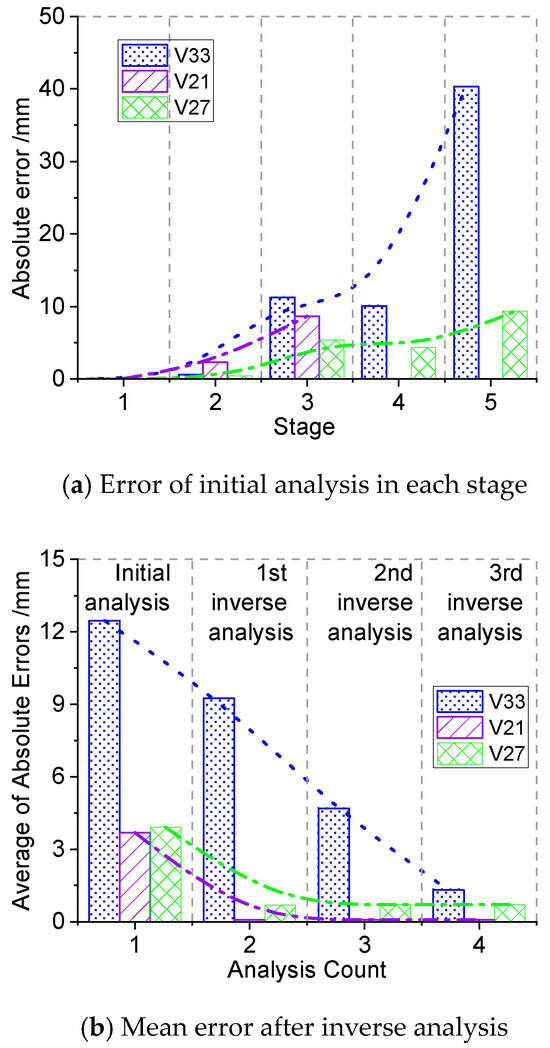 The initial analysis indicated a significant error between the predicted and measured horizontal displacement values at the pile top. As shown in Figure 20, as the excavation depth increases, this error also gradually increases. The maximum error reached 40.3 mm, far exceeding the limit allowed by the engineering project. The reason is that significant changes occurred in the soil parameters during the excavation process. It is difficult to accurately predict the deformation of the foundation pit using the original geological exploration parameters. Therefore, it is very necessary to dynamically update the model parameters through inverse analysis. After three iterations of back analysis, the error between the predicted and measured values continuously decreased. As shown in Figure 20b, the maximum value of the mean error decreases from 12.46 to 1.32 mm, meeting the precision requirements for engineering applications. Figure 20b demonstrates that the model’s predictive capability continuously enhances as the inverse analysis progresses.
