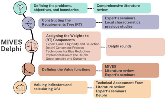 In the project framework, the third stage involves employing the Delphi method to assign weights to the identified components within the Decision Tree (RT) [58,59,60,61,62,63,64,65]. Delphi, chosen for its accuracy and adaptability, integrates seamlessly with MIVES and gathers expert consensus efficiently [40,47]. Its systematic approach controls bias, ensuring reliable weighting of criteria.