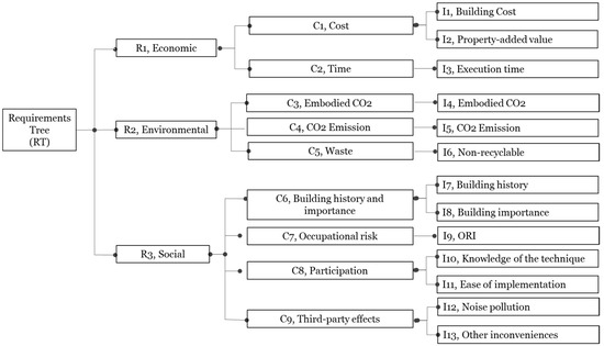 In this stage, a Requirements Tree (RT) is formulated to systematically organize the key sustainability parameters—requirements, criteria, and indicators—about the focal subject. The RT is structured hierarchically to assess stakeholders’ satisfaction and the sustainability facets of a specific process, system, or product [41]. The primary objectives of the RT are (a) to guide decision-making through the utilization of acquired indicator values and weights; (b) to offer a comprehensive perspective on the issue; (c) to organize assessment-related concepts; (d) to enhance stakeholders’ understanding of the model within the decision-making process; and (e) to facilitate subsequent mathematical analyses [47]. The RT is delineated into three primary levels. The first two levels, namely, requirements (Ri) and criteria (Cj), comprise general and qualitative components, while the third level involves quantitative and measurable indicators (Ik) [51]. To establish a robust RT, the authors identify potential sustainability parameters for assessing damaged reinforced concrete buildings. This identification is based on a comprehensive review of the literature and expert knowledge, as detailed in Table A1 (Appendix A). The parameters were refined to align with the sustainability objectives and boundaries in Section 2.1, prioritizing relevance, clarity, and measurability for the immediate reconstruction phase. For economic indicators (R1), long-term maintenance costs were excluded, while initial reconstruction costs were retained as a broader cost-related parameter. Reconstruction process duration was streamlined by consolidating it with demolition time into a single time-related indicator. For environmental indicators (R2), operational CO2 emissions were replaced with CO2 emissions during implementation, while embodied energy was excluded due to its removal from the ICE database. Social indicators (R3) were adjusted to emphasize cultural and historical importance, replacing historical significance and architectural preservation with building importance and history. Community engagement was merged with other social indicators to obtain indicator 13, while safety indicators were maintained. These refinements resulted in a practical and concise RT with 3 requirements, 9 criteria, and 13 indicators, ensuring its relevance to sustainability assessments in post-war reconstruction.