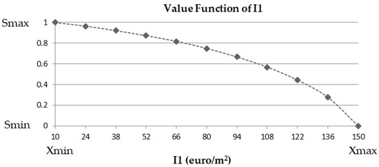 Illustrating the previous process, in Equation (2), A = 0 signifies the response value Xmax.; Xi represents the response to the evaluated indicator (I1, Building cost); ki = 1 approximates the ordinate of the inflection point; Xmax = 150 euro/m2 denotes the maximum abscissa value within the range of alternatives for the assessed indicator; Ci = 80 euro/m2 approximates the abscissa value of the inflection point; and Pi = 0.8 serves as the form factor for the curve. Factor B, defined in Equation (3), ensures that the function remains within the 0 to 1 range, where ki = 1; Xmax = 150 euro/m2; Xmin = 10 euro/m2 denotes the minimum abscissa value within the range of alternatives for the assessed indicator; Ci = 80 euro/m2; and Pi = 0.8. Figure 3 graphically illustrates this value function.