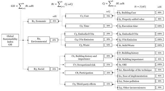 where indicators’ non-dimensional value (Ik), criteria’s non-dimensional value (Cj), requirements’ non-dimensional value (Ri), indicators’ weights (ωIk), criteria’s weights (ωCj), and requirements’ weights (ωRi). Figure 4 presents the defined RT with its mentioned components and GSI’s equations.