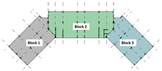 Building’s description: Comprising three blocks separated by two expansion joints, shown in Figure 5, each block features a partial basement floor and two additional floors. Predominantly constructed of reinforced concrete employing cement with a caliber of 350 kg/m3. Table 4 provides the technical characteristics of the building elements.