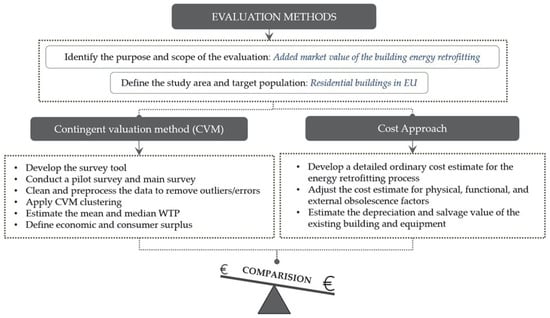 This study employs a structured framework that integrates the CVM to capture consumer willingness-to-pay and the Cost Approach to assess the financial impacts of retrofitting on property value. The methodology is applied to case studies in Italy and France, evaluating both partial and deep retrofitting to provide comprehensive insights into perceived and actual market impacts. Additionally, the study employs a dual-method approach to assess the impact of energy retrofitting on market values within a European context. By combining CVM and the Cost Approach, the study provides a detailed analysis of how retrofitting interventions influence the market value of residential buildings. Figure 1 provides an overview of the research methodology employed in this study.