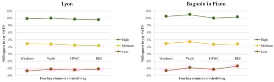 The data analysis shows significant stability in the respondents’ WTP, with similar perceived value for the four key elements of retrofitting (windows, walls, HVAC systems, and renewable energy solutions). This trend was observed in both Lyon and Bagnolo in Piano, with a slight preference for Bagnolo in Piano, likely due to its lower initial property values. Notably, high-performance windows and renewable energy solutions were rated highest, indicating their importance in energy efficiency and long-term savings. Respondents’ preferences seem to highlight their awareness of both functional and financial benefits.