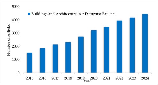 Figure 2 provides an overview of yearly publications on buildings and architectures for dementia patients over the last decade. To enhance the scientific rigor of this review and avoid potential issues such as data overlap or the inclusion of low-quality reports, the analysis has been refined to include only publications indexed in the Web of Science core collection. This approach ensures the representation of high-quality research. According to the refined data, the number of publications increased from 3329 in 2015 to approximately 11,849 in 2023, highlighting growing research support for integrating dementia-friendly buildings and community spaces into broader architectural frameworks.