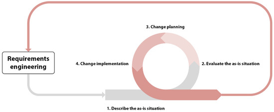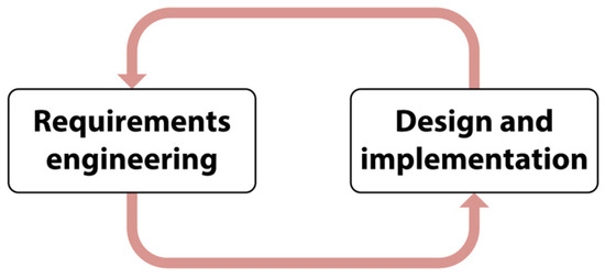 Since the early 2000s, the software engineering community has seen a tremendous change towards agile engineering to overcome issues often associated with plan-based development models by emphasizing continuous adaptation and customer collaboration [32,33]. In its essence, agile engineering postulates the introduction of short cycles, where each cycle focuses on a dedicated objective. After each cycle, the current state/progress of a project is evaluated, replanned if necessary, and execution continues with the next objective in line. At its core, agile describes a lightweight two-staged process that is repeated until all work is completed (see Figure 2). The first phase, i.e., requirements engineering, focuses on establishing the necessary requirements for the objective in the cycle. The second phase addresses the design and implementation of the objective, marking the end of the cycle. The SCRUM methodology [34] is one of the most established agile software engineering approaches. Agile engineering naturally anticipates change and goes hand in hand with metrics for assessing project progress and product quality after every cycle [12]. As for its benefits in faster time-to-market, higher quality software, and increased customer satisfaction, agile engineering has gained widespread acceptance nowadays, and has been systematically evaluated in several studies [35]. To fully deploy its benefits, agile engineering, however, demands constant communication and collaboration among all involved project stakeholders.