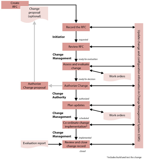 According to [36], a process for a typical change follows the model shown in Figure 3. Roughly speaking, to initialize a change, a request for change (RFC) containing relevant information regarding, e.g., initiator, trigger, and description is created and subsequently reviewed for feasibility. Such an RFC usually is motivated by either a necessary change or the addition of a feature, which eventually also boils down to a change that must be applied. If not rejected, the proposed change is assessed and evaluated, i.e., relevant resources are identified, and the impact of the change is elicited. After authorizing the change, given the RFC’s evaluation and assessment, the change is implemented and finally reviewed. That is, stakeholder satisfaction and resource consumption are evaluated regarding the achievement of the change’s objective. In synopsis, change management defines a framework, based on best practices, that aims at (i) minimizing risk and costs, (ii) optimizing efficiency and consistency, (iii) enhancing communication, (iv) alignment with operational strategies, and (v) reducing costs.