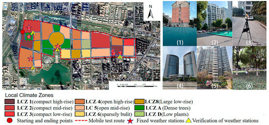 This study involved the creation of a closed mobile route encompassing forty-one mobile test locations surrounding Swan Lake in Hefei, utilizing six concurrently running fixed weather stations and four validating weather stations, as seen in Figure 1. The research location is situated near the water, with negligible traffic congestion. The mobile test route included a total length of 10 km, encompassing 41 mobile measurement locations with varying surroundings and configurations, from dispersed low-rise building zones to densely crowded urban centers. Six fixed weather stations (HOBO-U23-002), designated as FS01 through FS06, served as time-adjusted reference stations, while four validation weather stations, labeled VSO1 through VS04, were employed to assess the errors of the four temporal correction models. To address the various underlying surface conditions of the reference stations, the six station LCZ types—LCZ1, LCZ2, LCZ3, LCZ4, and LCZ8—along with the site environments of these four weather stations, are presented.