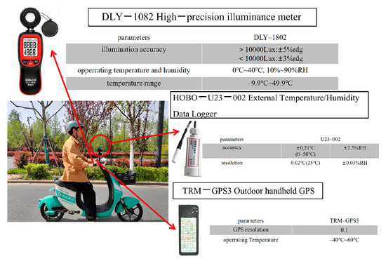 A mobile measurement was conducted using an e-bike equipped with a portable, radiation-shielded external temperature and humidity recorder (HOBO U23-002) and a GPS to identify the 41 test sites. The apparatus was fixed to the e-bike at a height of 1.5 m above the ground, as illustrated in Figure 2. Data from the air temperature and relative humidity logger, together with GPS, were recorded at one-minute intervals to assure the precision of each test site. An illuminance meter (DLX-1082) was employed to document the shading along the moving route, and it was calibrated using data from ArcGIS. Furthermore, the e-bikes maintained an average velocity of 20–30 km/h and primarily traversed slow lanes to approach the local thermal environment while minimizing exposure to thermal emissions from vehicular traffic.