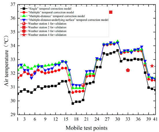 In this context, vya and vyc represent the temperature recorded by the validated weather station at the specific moment and the temperature at that moment following the adjustment of location points along the mobile measurement route, respectively; y signifies the identifier for the validated weather stations; and the adjusted air temperature values derived from various temporal correction models are illustrated in Figure 3. Despite the small error of the “Multiple-distance-underlying surface” temporal correction model, the large difference in the temperature between validation point two and validation three and the corresponding measurement points on the moving route is due to the fact that the area where validation point two is located is a plaza, which is not surrounded by any building or environment for shade, while validation point three is surrounded by a high-rise building, which is able to provide shade, hence the large difference in the temperature between the two validation points.