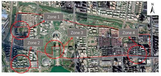 Hefei is situated in eastern China, within the Jianghuai Plain, characterized by an undulating landscape and minimal geographical variation. The subtropical humid monsoon climate is characterized by chilly winters and hot summers. In recent years, Hefei has experienced significant social and economic development, transitioning from a “ring city” to a “lake” configuration, resulting in an expansion of the urban built-up area. The city has been constructed on an increasingly expansive scale, transitioning from “lakefront” to “embrace the lake”. The rise in population density distribution, along with the nature of urban surface coverage and building design, has led to alterations that contribute to the complexity of spatial diversity [47]. The vicinity of Swan Lake in Hefei, a representative region of the city, was chosen as the study area to encompass a diverse array of built environment types, as illustrated in Figure 1. The study area encompasses multifunctional zones, including residential districts, commercial centers, entertainment venues, and urban parks, primarily featuring a mix of medium-to-high-rise and low-rise structures with diverse architectural designs, thereby facilitating a comprehensive sample of local climate zones (LCZs). The LCZ scheme has been utilized to assess the spatial morphology of the case area [48]. This paper employs a neighborhood-based LCZ classification method [49] to categorize the urban neighborhood units within the case area into various LCZ types, thereby illustrating the heterogeneity of urban morphology, as depicted in Figure 1.