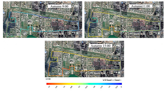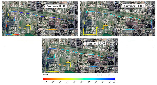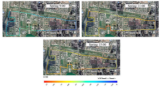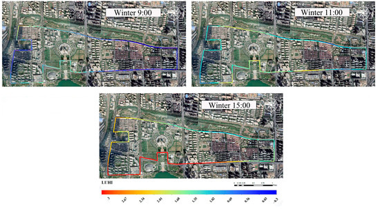 The precise distribution of heat island intensity along the moving routes was examined in relation to the four zones depicted in Figure 4. In the comprehensive analysis of Figure 5, the LUHI values in the Hefei Swan Lake research region throughout various moments of the spring testing period predominantly ranged from −3 °C to 2.5 °C along the mobile measurement routes. The spatial distribution of LUHI values across various moments on mobile routes exhibits considerable spatial disparities; nevertheless, the variability of the heat island intensity distribution over the entire routes in spring is not substantial. Zone 2 primarily consists of a dense high-rise building complex, with LUHI values in this area progressively increasing over time, while the heat island intensity at 9:00 is minimal. The maximum LUHI value in this region attains 1.95 °C post 11:00. Figure 6 illustrates the spread of local heat island intensity along the summer mobile measuring route. The disparity in heat island intensity distribution along the summer mobile route is more pronounced than in spring; however, Zone 3 maintains a higher LUHI value. Despite the presence of green space in this area, it is significantly influenced by solar radiation due to its open nature, resulting in an elevated LUHI value. Zone 1 comprises the People’s Park, where the abundant greenery significantly mitigates heat island intensity, particularly during the summer months. Zone 2 and Zone 4 are both high-rise residential districts; however, a notable disparity exists in the distribution of heat island intensity. This variation arises because the mobile route in Zone 2 is obscured by a viaduct, resulting in a lower LUHI value for this route due to the combined shading effects of the building and the viaduct, while the LUHI value for the surrounding area remains elevated. The LUHI values are diminished, attaining 0.1 °C, approaching the LUHI values of the park adjacent to Zone 1. In contrast, the shading along the mobility route in Zone 3 is inconsistent, resulting in elevated LUHI values, indicative of greater heat island intensity in that region. Figure 7 depicts the distribution of local heat island intensities along the mobile measurement route in autumn, revealing a distribution that closely resembles that of spring and exhibits minimal variability in heat island intensities. Figure 8 illustrates the spread of heat islands during the winter measuring period, revealing significant variations in heat island strength at different times. The LUHI value of Zone 1 remains low, exhibiting the “cold island effect”. Zones 3 and 4 demonstrate a more pronounced heat island effect, with the maximum LUHI value reaching 3 °C. Zone 2’s LUHI value, influenced by shading, also attains 3 °C. Zone 2 maintains a reduced LUHI, which is attributable to its shade impact.