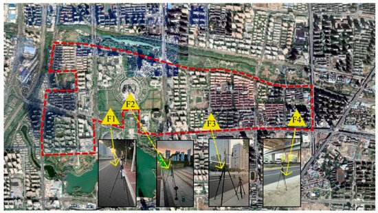 This section analyzes the impact of shade on the thermal environment of the slow lane by selecting representative measurement stations throughout the route, with field observations conducted on 28 September 2024 from 6 a.m. to 6 p.m. The positions of the four designated measuring spots are illustrated in Figure 9. Fixed weather stations (HOBO-U23-002) were installed at an elevation of approximately 1.5 m above ground level, designated F1 to F4, and surface temperatures were taken and documented at 30 min intervals. The Ts was measured and documented every 30 min using an infrared thermal imager (UTi160s) to capture images of the area surrounding the weather stations, with infrared images taken bi-hourly. Additionally, a black sphere recorder (Taiwan Hengxin AZ8758) was positioned at measurement points two and three to record the temperature of the black sphere every 5 min. The instrumentation locations are illustrated in Figure 9, with the black spheres having resolutions of 0.1 °C, 1.5 °F, and 0.5 °C. The black spheres were positioned roughly 1 m above the ground. The black sphere recorder has a resolution of 0.1 °C and an accuracy of ±3 °C under outdoor conditions, while the infrared thermal imager (UTi160s) has a resolution of 0.1 °C and an accuracy of ±2 °C. The black sphere recorder (Taiwan Hengxin AZ8758) was positioned at Station 2 and Station 3 to monitor the black sphere temperature at 5 min intervals.