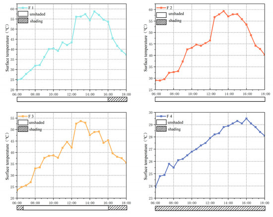 The analysis of measurements at four representative points reveals that shading influences the variations in the thermal environment along the travel route. The air temperatures at F4 exhibit a greater disparity compared to the other three measuring points. A comparison of their average hourly air temperatures indicates that the temperature values at the point located beneath the viaduct are markedly distinct from those at the other three locations, with a maximum average difference in Ta ranging from 3 to 5 °C across various time intervals, and an overall average that is 1.7 to 2.0 °C lower than that of the remaining three measuring points. The sequence of mean Ts across the tests, in ascending order, was F4 < F3 < F1 < F2. The mean surface temperature at F2 was approximately 17.4 °C greater than that at F4, as F4 was obscured by the viaduct, which diminishes shortwave radiation, reaching the ground more effectively than the tree shading at F1.