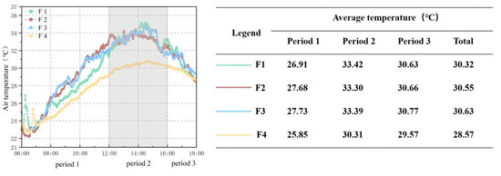 The disparities in Ta among F1, F2, and F3 are minimal; however, the discrepancies in Ta between F4 and the other three sites are significant, with a maximum average difference in Ta ranging from 3 to 5 °C at various periods during the day, as shown in Figure 11. In comparing the average hourly Ta, only F4 exhibits a substantial difference from F1, F2, and F3, with F4 regularly recording the lowest Ta, averaging 1.7–2.1 °C lower than F1, F2, and F3. Among all measurement stations, F3 recorded the highest Ta during time period 1; however, this diminished markedly after 14:00. Conversely, F2 exhibited the highest Ta in time period 2, while F3 again had the highest Ta in time period 3. Moreover, F4 exhibited the shade structure of a viaduct and reported a somewhat higher Ta compared to the other three measurement points over the three period intervals. The maximum disparity in Ta readings between shaded and unshaded Ta at measurement points FI and F3 was approximately 11.9 °C, while F2 emerged as the hottest location at the onset of time period 2 due to the escalation of solar radiation. The mean surface temperature variations are significantly diverse throughout the observation period, arranged in increasing order, as follows: F4 < F3 < F1 < F2, with F2’s mean surface temperature being 17.4 °C greater than that of F4.