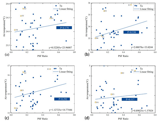 Correlation analysis between PSF and Ta ((a) for spring, (b) for summer, (c) for autumn, (d) for winter).