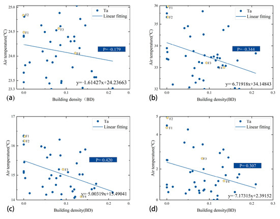 Concerning the influence of building density on air temperature along the transit route, as illustrated in Figure 14, there exists a negative correlation between building density and air temperature. This suggests that increased building density may enhance the thermal environment of the slow-moving road to a certain degree. Furthermore, Figure 14b indicates that, during summer, measurement points F3 and F4 fall below the fitted line, while measurement points F1 and F2 are positioned above it. Notably, the locations of measurement points F3 and F4 correspond to an area characterized by high-density, high-rise buildings. The resultant building shade can enhance the thermal conditions of the slow lane.