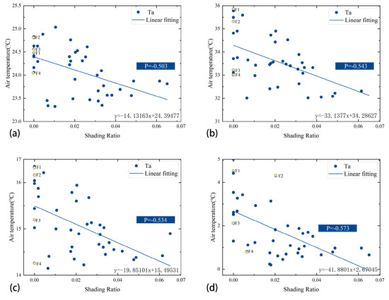 Correlation analysis between shading ratio and Ta ((a) for spring, (b) for summer, (c) for autumn, (d) for winter).