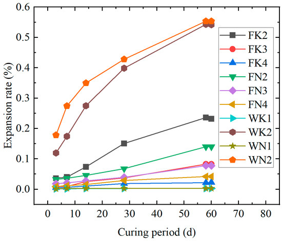 On 3 d, 7 d, 14 d, 28 d, 58 d, and 60 d, the specimens WK1, WN1, WK2, WN2, FK2, FK3, FK4, FN2, FN3, and FN4 were taken out from the solution to determine their expansion rates.