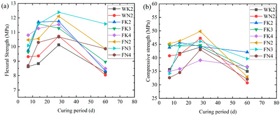 Relationship between (a) flexural strength, (b) compressive strength, and specimen age.