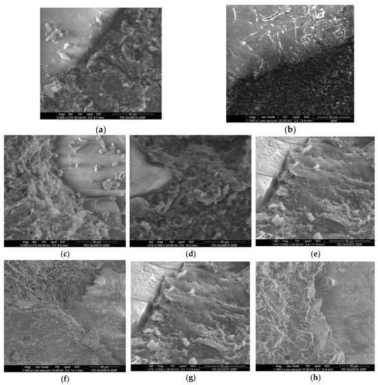 SEM images of different specimens. (a) WK2; (b) WN2; (c) FK2; (d) FK3; (e) FK4; (f) FN2; (g) FN3; (h) FN4.