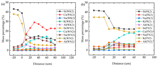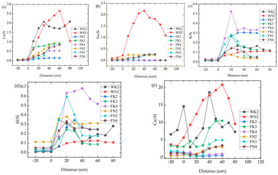 The properties of ASR gel are not only related to Si, Ca, and other elements, but also depend on the atomic ratio of these elements [21]. As shown in Figure 6, compared with WK2 and WN2, the element ratio of the interface transition zone of the sample mixed with fly ash is lower than that of the reference sample in Ca/Si, Na/Si, and Ca/Al, while K/Si and Al/Si are higher and have a sudden increase. The higher the replacement amount, the more obvious the change. It has been found that the higher the Na/Si and K/Si values, the greater the swelling rate and water absorption of the gel, which is more likely to cause ASR [21]. However, after the admixture partially replaces the cement, Na/Si decreases, K/Si increases, and the expansion rate is lower than that of WK2 and WN2 specimens. It can be seen that it is not comprehensive to judge whether ASR occurs only by Na/Si and K/Si values. In addition, studies have shown that the C-S-H gel with low Ca/Si generated by the secondary hydration reaction has a high specific surface area and a strong ability to adsorb cations [30]. This experiment found that Ca/Al also has a low concave phenomenon in the interface region. In some experiments, ASR gels with different Al/Si were prepared. It was found that an increase in aluminum can reduce swelling and silicate leaching, create a compact structure, and reduce water absorption [31]. Schumacher believes mineral admixtures with high Al2O3 content can more effectively inhibit ASR [17]. SiO2 first reacts with OH to form acidic Si-OH [32]. The introduction of Al can also increase the acidity and concentration of Si-OH and enhance the adsorption capacity of alkali. Adding mineral admixtures can reduce the gel’s Ca/Si and Ca/Al, enhancing its adsorption and fixation ability to alkali. Therefore, it is one-sided to attribute the mechanism of mineral admixture inhibiting ASR solely to the low CaO content, and adding Al2O3 is also key.