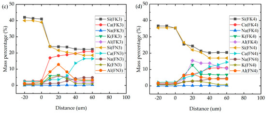 Elements in the interface area of pure cement and fly ash mixed specimen. (a) pure cement specime; (b) 20% fly ash instead of Portland cement; (c) 30% fly ash instead of Portland cement; (d) 40% fly ash instead of Portland cement.