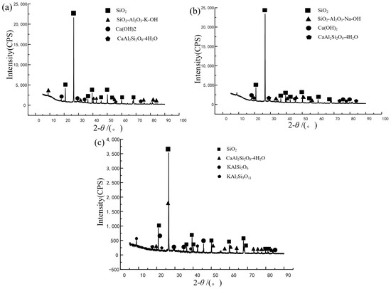 To further verify the mechanism of mineral admixtures inhibiting ASR, the samples of WK2, WN2, FK4, and FN4 soaked for 60 days were analyzed using XRD (Figure 7). The results show that KAlSi2O6 (leucite) and KAl3Si3O11 (nepheline) are formed in FK4 under the KOH environment, and KAlSi2O4 also exists in FN4, which are all framework aluminosilicate minerals, further indicating that the enrichment of K and Al in the interface transition zone is related to the inhibition of ASR. In such minerals, aluminum atoms replace some silicon atoms to form aluminum oxygen tetrahedrons, which are negatively charged and attract positive alkali ions for compensation due to the charge imbalance caused by the lack of one valence of aluminum [31]. This structure allows cations and water molecules to pass freely, keeps the crystal stable and not easy to expand, and enhances the cation adsorption capacity due to the large specific surface area.