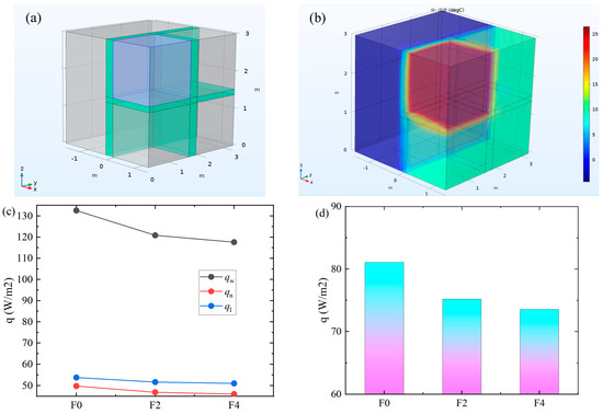 Influence of fly ash on building heat dissipation. (a) 3D room model; (b) Thermal diagram of the room (“体: 温度”: Body surface: temperature); (c) heat dissipation flux of concrete; (d) average heat dissipation flux.