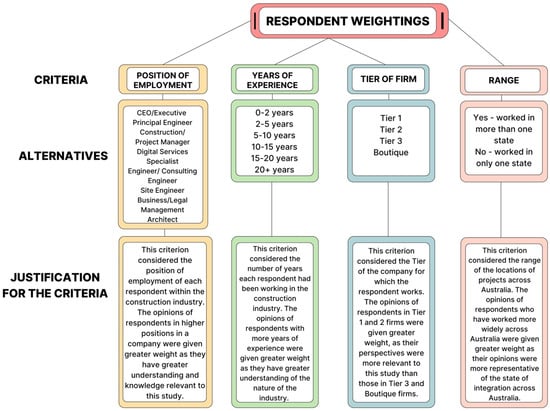 - The average of each row of the standardised eigenvectors for each criterion was calculated [97]. This average constitutes the value of the weighted eigenvector (respondent weighting).