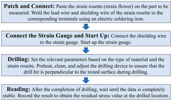 For the measurement of residual stress, the main equipment used is the ASMB2 resistance strain gauge and the RSD1 residual stress drilling device. The main experimental steps are as follows (Figure 1).